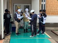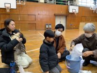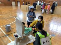 体育館では、簡易トイレや段ボールベッド、外では、防災倉庫の見学や給水栓の見学など、避難所に関わるさまざまな体験ができました。