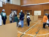 を行いました。開設訓練の開始時は雨が降っていましたが、一般の方々の参加が始まる頃には雨も上がりました。避難所運営委員会の会長が開設の概要を、半田市防災安全課の方が、「防災講話」としてハザードマップの活用や災害リスクの理解、防災行動計画(マイタイムライン)の説明をしてくださいました。また