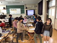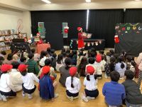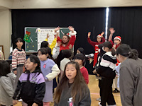 の下、太鼓を使って、お祭りのリズムに親しんでいました。一人一人が考えたリズムを、グループ内の違う友達が演奏し、さまざまなリズムを楽しんでいました。日本の楽器に触れられるよい機会になりました。