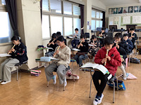 の様子です。「気持ちを合わせて、きき合いながら演そうしよう」ということで「ルパン三世のテーマ」に取り組んでいました。全員がリコーダーで演奏した後、オルガン、鉄琴、シンバル、トライアングルなどの楽器を使って、合奏に向けて練習していました。