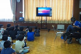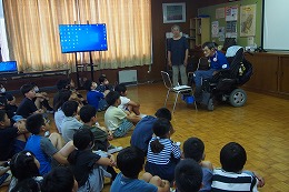 福祉実践教室第2弾は、障がいをもつ方2名をお招きし、お話をしてもらいました。 身体障がいの方は、足で写真の撮り、映像にしてあるものを子どもたちに見せてくれました。 この映像を見てどんな気持ちになった?という質問をされました。 美しい映像に子どもたちは感動し、「幸せな気持ちになった」と答えていました。 第1弾で教えてもらった、「ふ(だんの)く(らし)し(あわせ)」です。  もうお一人は、ろう者の方です。 手話通訳の方にもお越しいただき、お話を聞くことができました。 写真を子どもたちに見せ、「この中にろう者はいると思うか?」と聞きました。 ろう者と健常者は見分けることができないということを最初に伝えてくれました。 また、来客がきたときのドアホンが聞こえないからどのようにしているか、病院の診察予約をとるときや宅配を頼むときに電話が使えないけれどどうしているか、など、普段考えたことがないようなことを投げかけてくれました。 子どもたちなりに考えていました。 今は、「電話リレーサービス」というのがあり、リモートで手話で伝え、それを電話してさらに伝えてくれるサービスがあるそうです。まさにリレーです。 このサービスのおかげで暮らしやすくなったと言っていました。  ろう者の方が、一番心配なことは、「災害の時」だそうです。 知り合いの方が避難所で過ごしたとき、放送が聞こえず、食料の配付がわからず3日間何も食べなかったという話をしていました。 子どもたちには、そういうときは、手をひいて一緒にいってほしいと伝えていました。 また、ろう者とコミュニケーションをとる手段が6つ ①手話 ②口話(口唇術 口の動きを見る) ③筆談 ④空書 ⑤身振り ⑥スマホ
