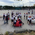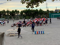 片付けの様子です。5、6年生の動きが早く、あっという間に終わりました。大玉の空気を抜くのは先生たちの役目です。大変な作業ですが、見た目はくつろいでいるかのようです…。