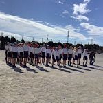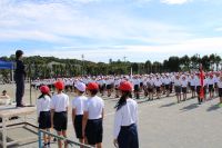 運動会を実施するために、早朝より、運動場の水抜きや土入れなどを行いました。子どもたちが登校し、委員会ごとに準備を行いました。手際よく進められ、予定よりも早く終わりました。いよいよ、開会式が始まります。