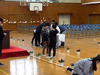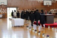 が卒業式に向けて準備をしました。心を込めて、隅々まできれいにしました。体育館では赤絨毯を敷いて、その上を踏まないように気を付けながら、会場準備をしていました。椅子の縦列横列も、きちんと揃えました。予定時刻よりも、早く終えることができました。