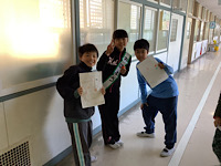 の様子です。水入りの筆ペンを使って、水書用紙に練習しました。筆ペンは立てて持って書くため、形を整えて書くのが難しそうでした。いろいろな線や今まで習った漢字、自分の名前などを練習しました。水で書くので、時間がたつと消え、魔法のようでした。楽しんで、何度も練習することができました。
